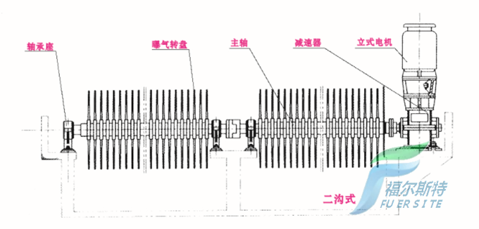 BZP型轉盤曝氣機,由立式電機、齒輪減速器、主軸、曝氣轉盤、軸承座、潤滑系統及控制柜等組成。曝氣轉盤的充氧和推流能力可通過增減轉盤數、改變浸沒水深或轉速來進行調整。